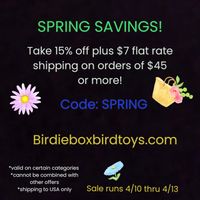 These are the approved rescues and sanctuaries that we will ship to for free. When ordering from our site for one of these facilities, we offer free shipping on the items that will be sent to them. Use code : RESCUESHIPPING Free shipping is NOT valid unless the items are being sent to an approved facility on our list. Offer is only for U.S. based facilities If you are a rescue or sanctuary and would like to be added to our list, please contact us. birdieboxbirdtoys@gmail.com * The Gabriel Foundation